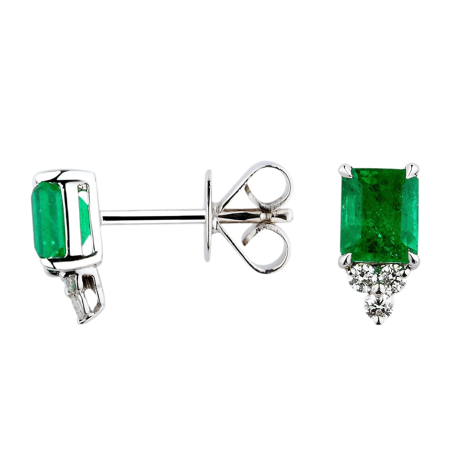 18 KW Diamond & Emerald Earring features 2 emerald TTW 1.08 CT, and 6 round diamonds TTW 0.08 CT under the emerald.