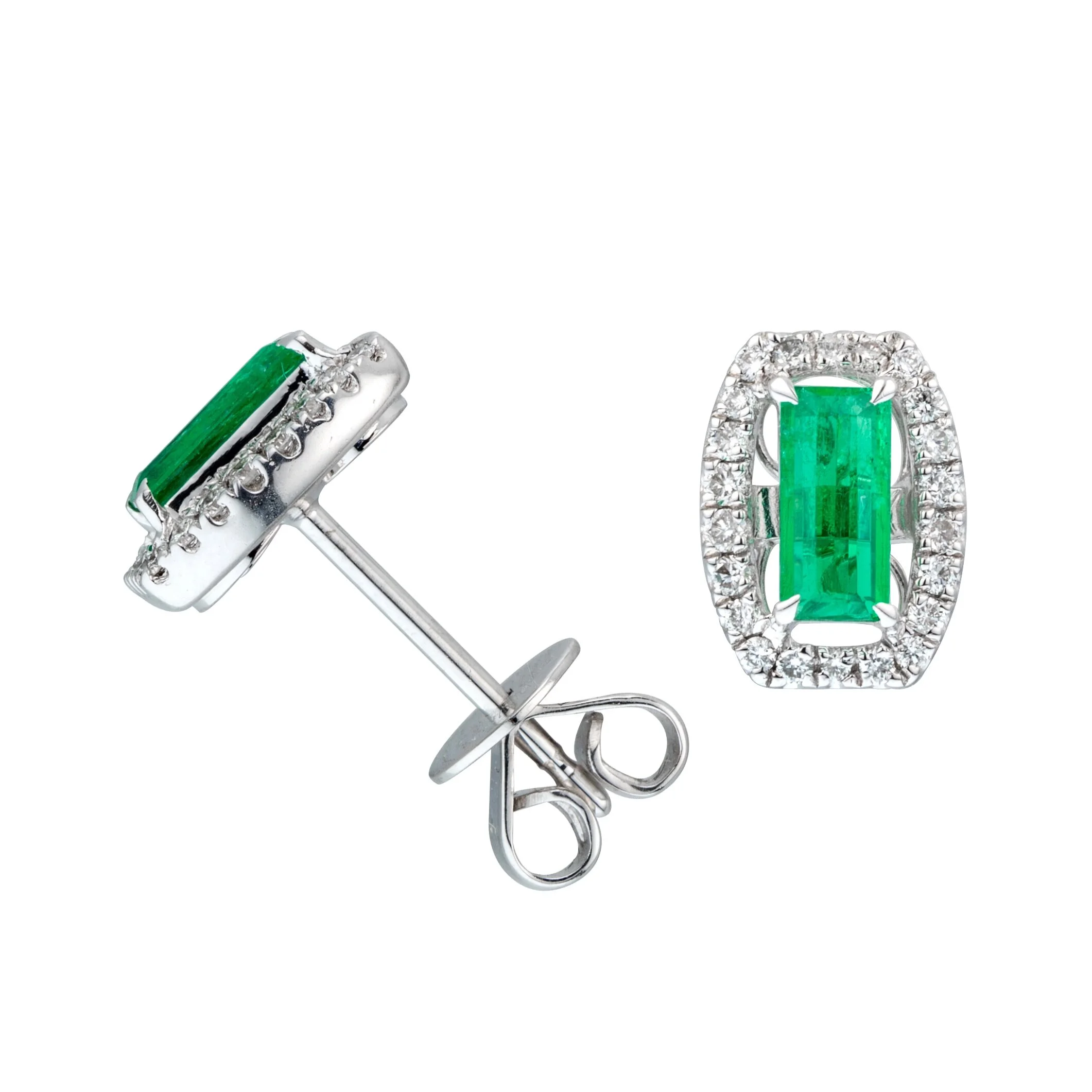 18 KW Diamond & Emerald Earring features 2 emerald TTW 0.54 CT, and 44 round diamonds TTW 0.19 CT as the halo.