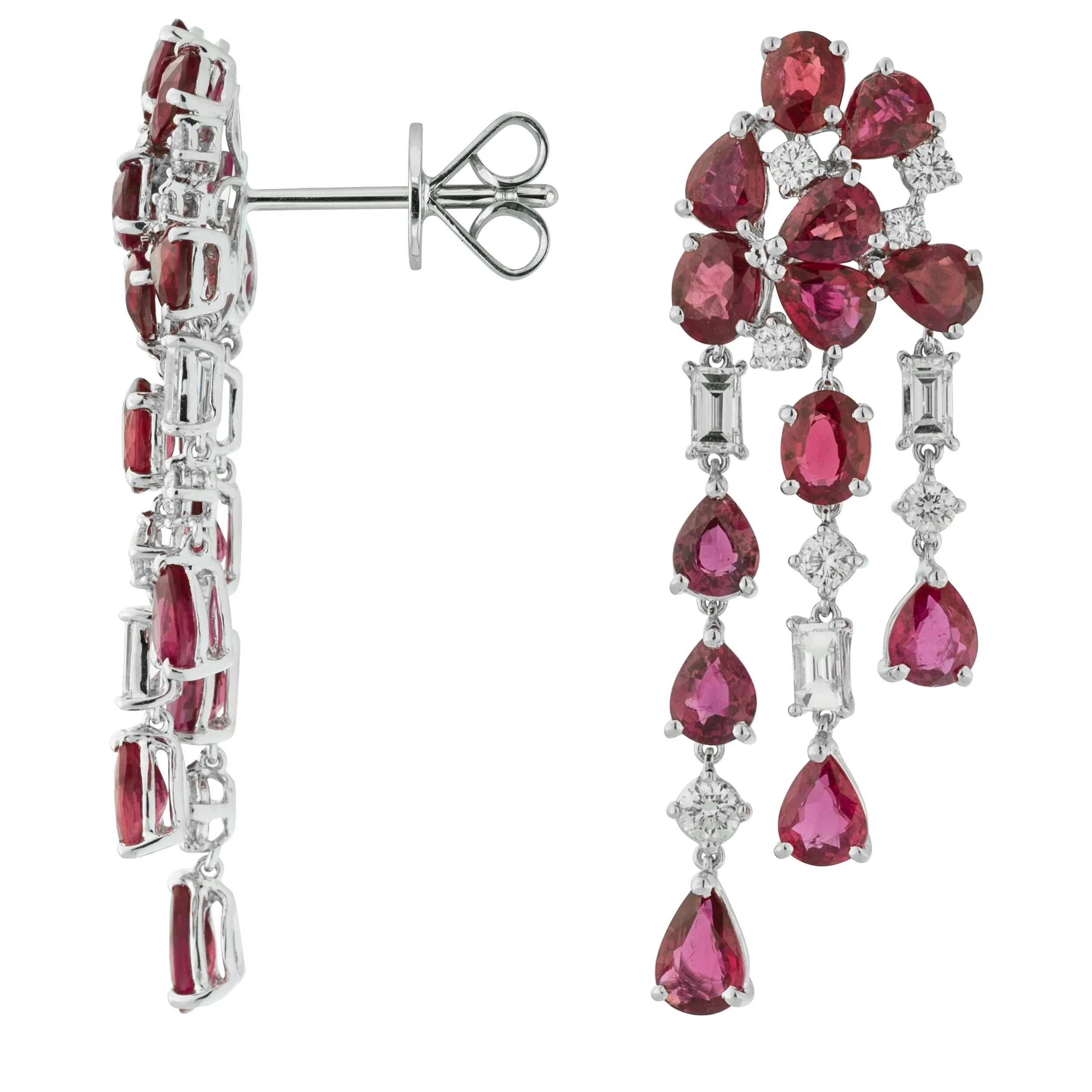 18 KW Diamond & Ruby Dangling Earring features 13 ruby on 3 strip row a side (TTW 10.44 CT for 26 ruby), and 3 baguette diamond and 7 round diamonds on 3 strip row a side (TTW 1.48 CT for 20 diamonds).