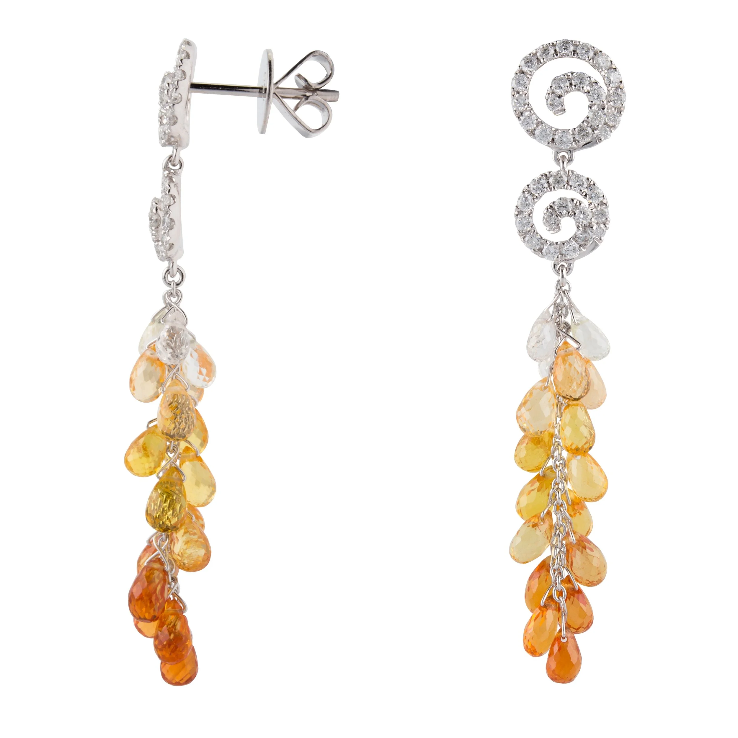 18 KW Color Sapphire Dangling Earring features 34 color sapphire TTW 11.33 CT, and 70 round diamonds TTW 0.72 CT.