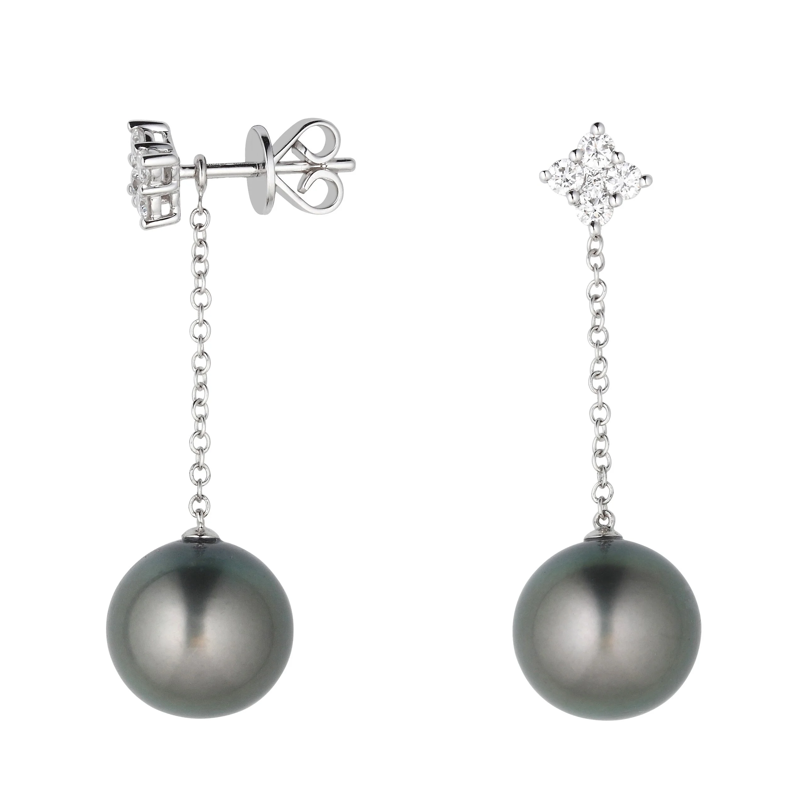 18 KW Black Pearl Stud Dangle Earring features 2 South Sea pearls, and 10 round diamonds TTW 0.38 CT.