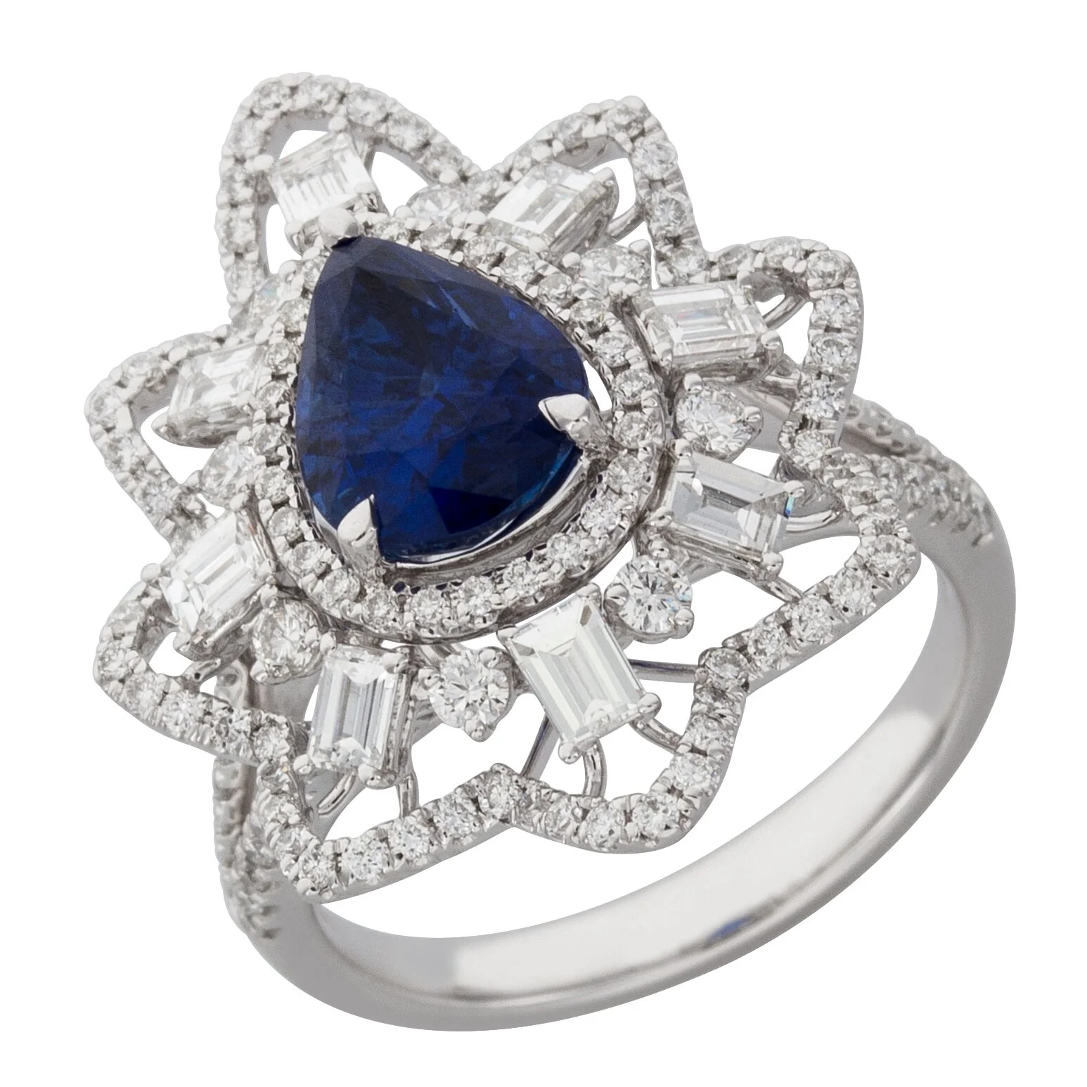 18 KW Diamond & Sapphire Ring features a sapphire as center, 8 baguette diamonds TTW 0.57 CT, and 126 round diamonds TTW 0.79CT.